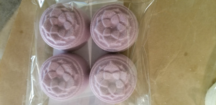 My shower steamers has menthol, which really wakes up the senses and clears the sinuses. It's especially good if you have a cold or stuffy nose. They're 4 different scents. Lavender (purple), Spearmint (green), peppermint (pink) and citrus (yellow). I hand press each of these. I usually always have the lavender, mint and citrus in stock in one form or another. These make excellent hostess gifts and I love taking a few with me when I travel for my hotel showers!